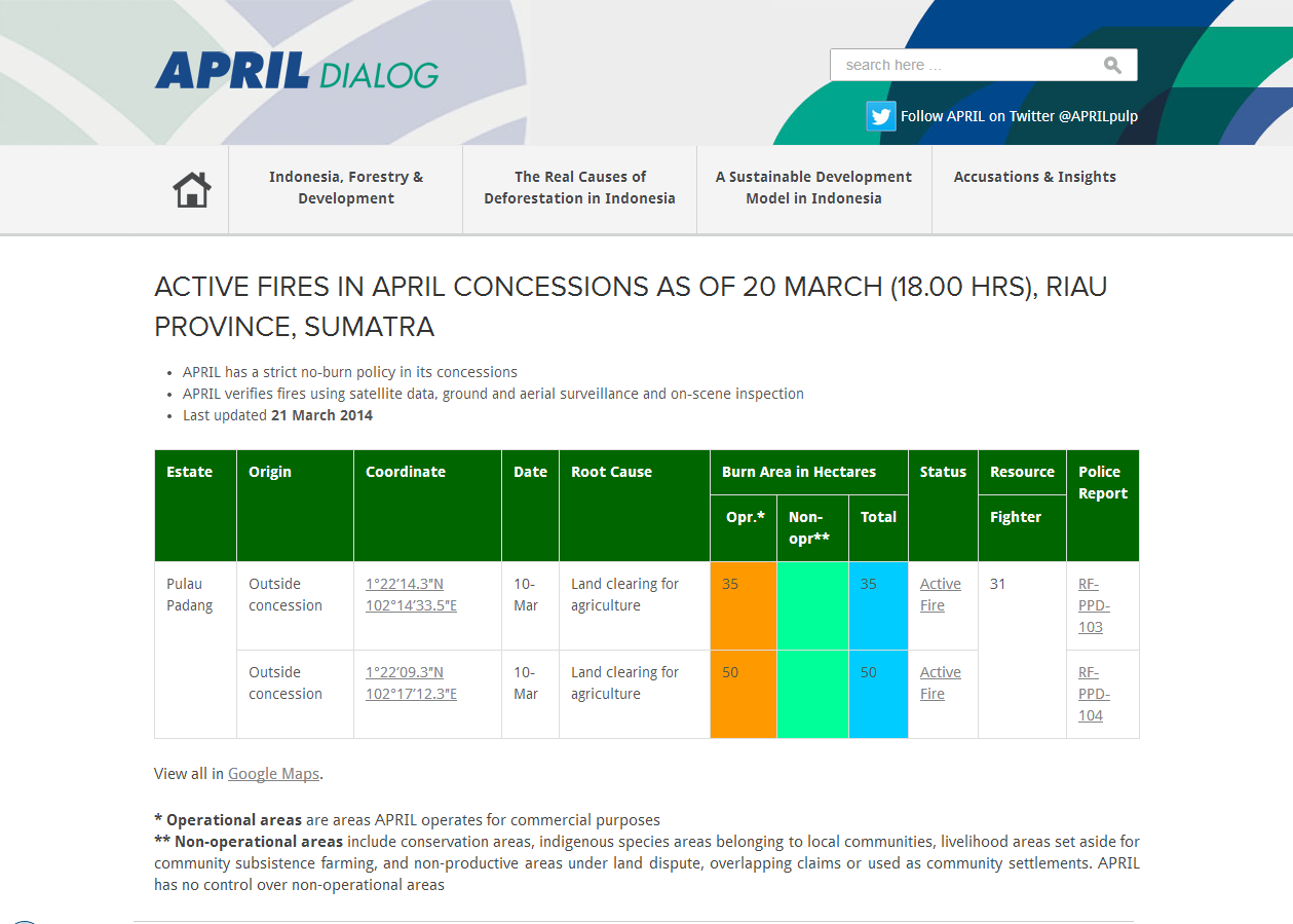 APRIL said it will post reports taken from daily on-the-scene inspection of its concessions in Riau Province. The reports are available through the company’s blog, APRIL Dialog, Fire Tracker page. They include: